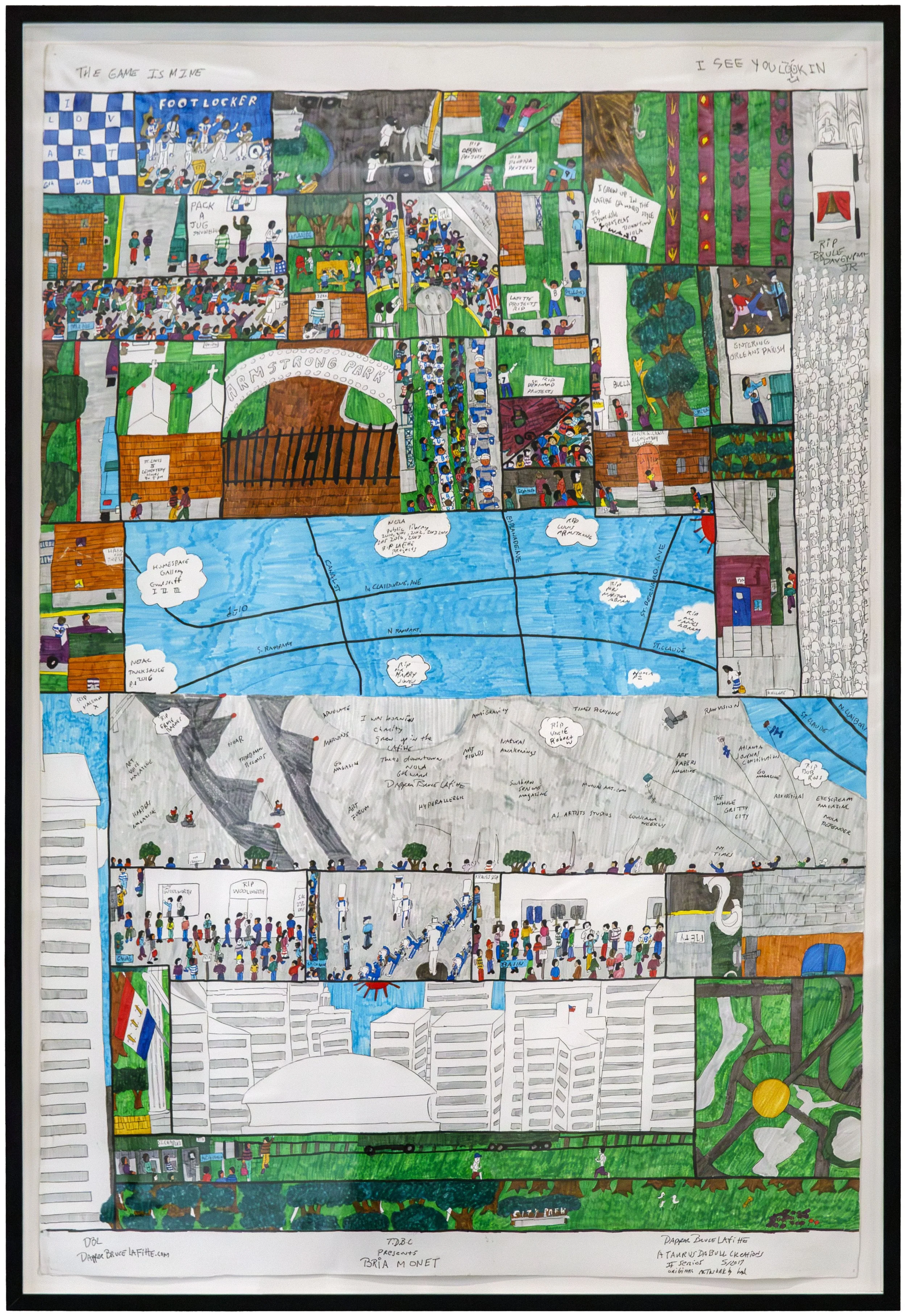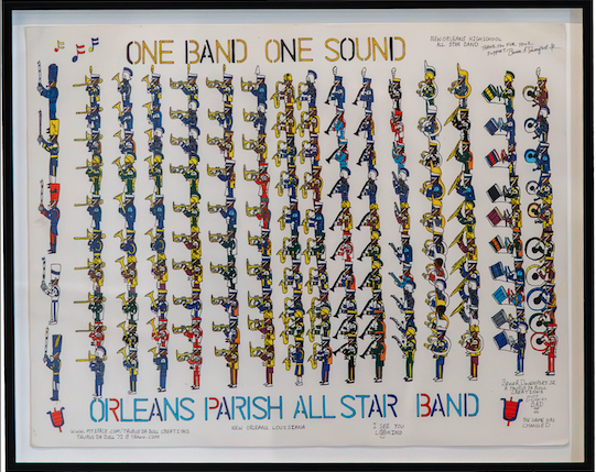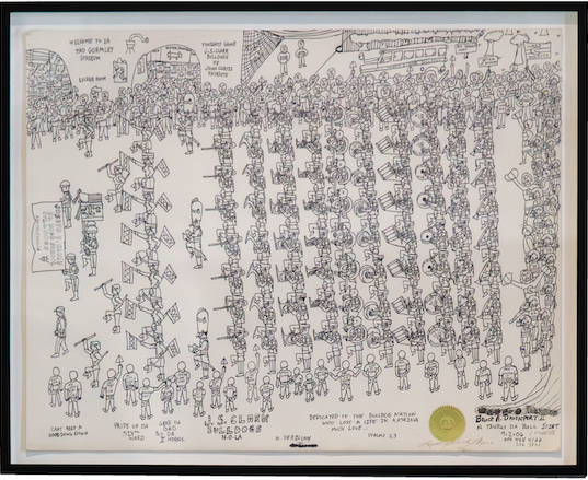Think of the show at NOMA as Lafitte’s proof of concept on display. You can see him experimenting with design-oriented compositions, first with marching bands in straight-ish lines, then on football fields and parade routes. He worked out how to imprint himself on pieces, mainly by incorporating touches drawn from hip-hop and the Black pop culture he grew up with. He incorporates handwritten text in his pieces like graffiti, but those bits of text speak directly to the viewer or the piece’s subjects. He started referring to his pieces as “Taurus Da Bull Creations,” a bit of branding and self-mythologizing along the lines of director Spike Lee referring to his movies as “a Spike Lee Joint.”